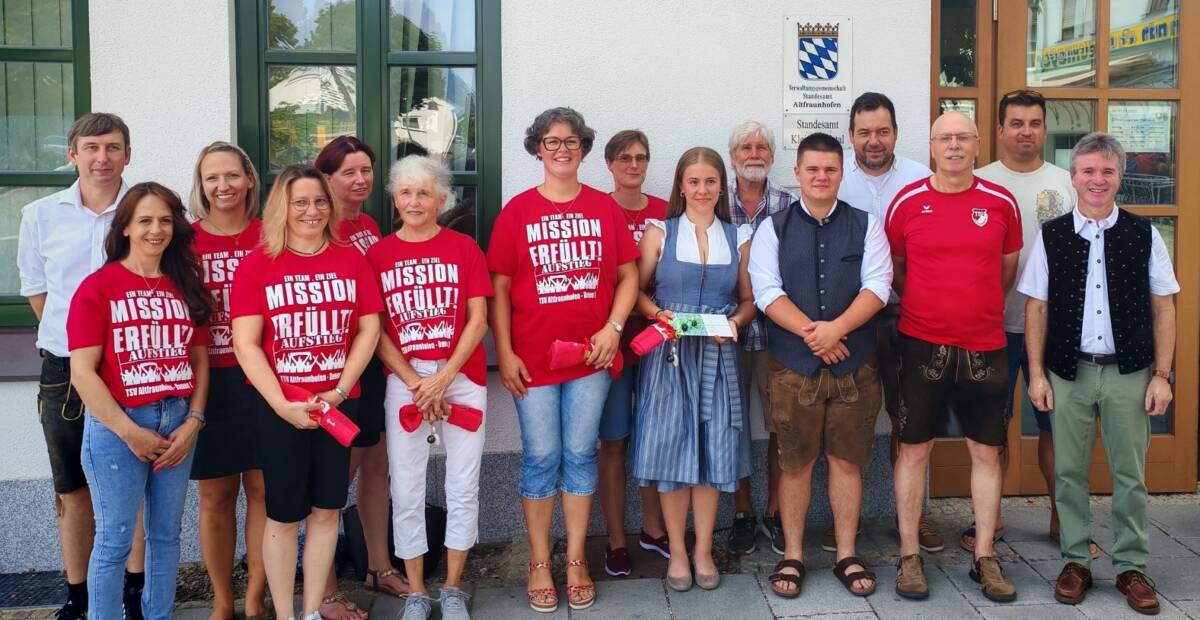 Nun wurden am Sa., den 5.7., die beiden Mannschaften und Veronika Reiser vom Bürgermeister Johann Schreff zu einem Sektempfang ins Rathaus eingeladen, um sich ins Goldene Buch der Gemeinde einzutragen. Für alle Geehrten gab es ein kleines Präsent der Gemeinde. Am Abend fand dann noch die Saisonabschlussfeier der Kegelabteilung statt, dort wurden die Erfolge aller acht Mannschaften gefeiert.