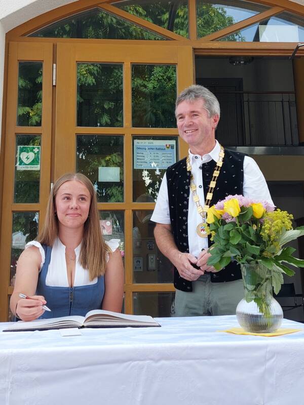 Bürgermeister Johann Schreff und Veronika Reiser (Deutsche Meisterin U14 weiblich), die sich ins Goldene Buch der Gemeinde Altfraunhofen einträgt)